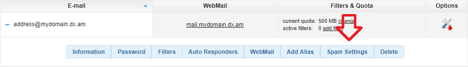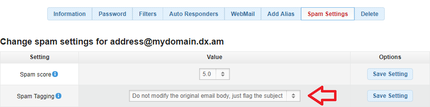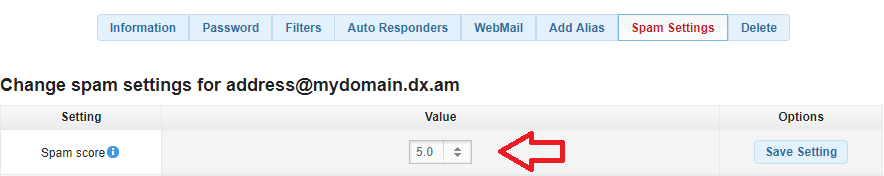 To enable spam tagging on an e-mail account, open the Spam Settings menu and select a Spam Score value from the drop-down list. Keep in mind that if you set a smaller Spam Score value, our anti-spam filtering system may consider regular non-spam messages as spam.