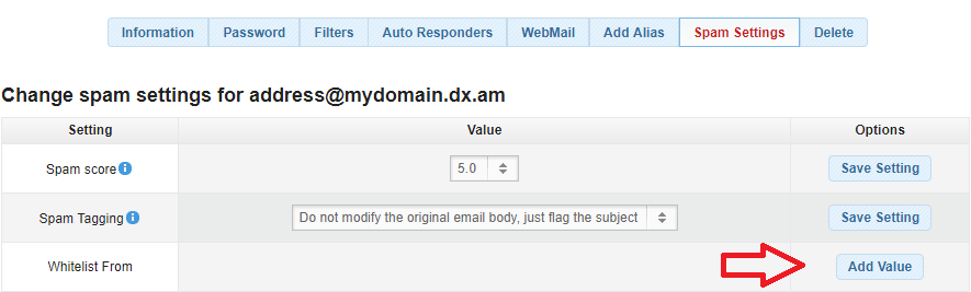 You can allow messages from specific email addresses and domain names to come into your AwardSpace.com mailbox by performing the following three actions: