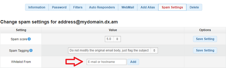 - In the E-mail or hostname field, enter the address of the e-mail account/domain name that you wish to allow.