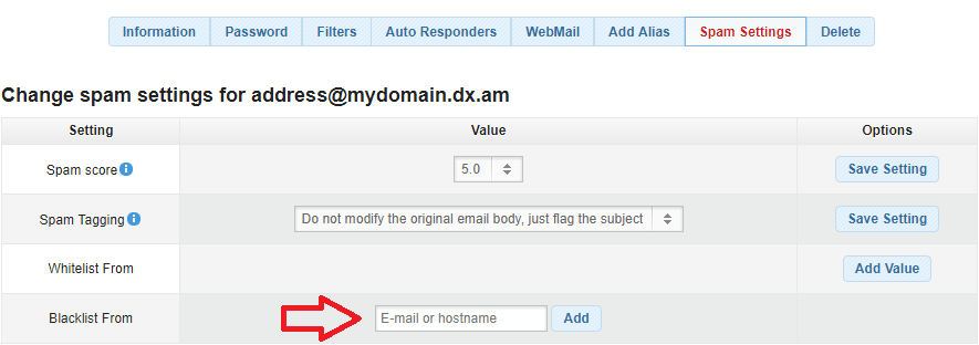 - In the E-mail or hostname field, type the address of the e-mail account/domain that you do not wish to receive further messages from.
