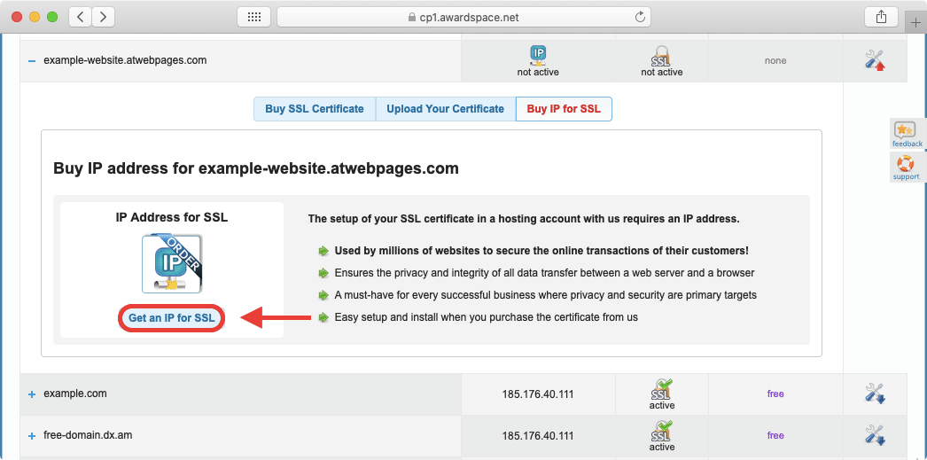 3. From the three tabs that appear, choose the Buy IP for SSL tab.