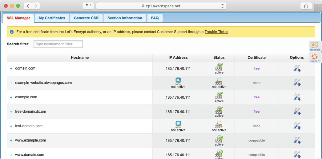 SSL installation needs to be carried out in the SSL Manager section of our Hosting Control Panel if you are using one of our shared hosting packages. The shared hosting plans that include SSL functionality are our premium shared hosting and our Semi-Dedicated web servers. Due to its advanced nature, the ability to install an SSL certificate is not possible on our free website hosting.