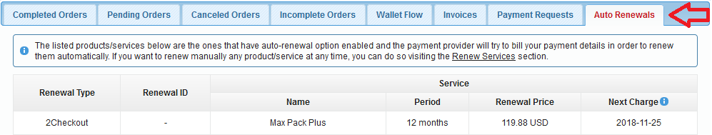 To see if the automatic renewal is enabled for a specific service/product in your account, please select the Auto Renewals tab.