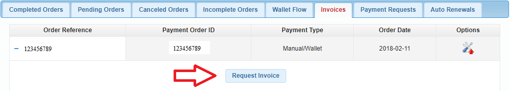 To request an invoice, open the Invoices tab and click on the Request Invoice button.