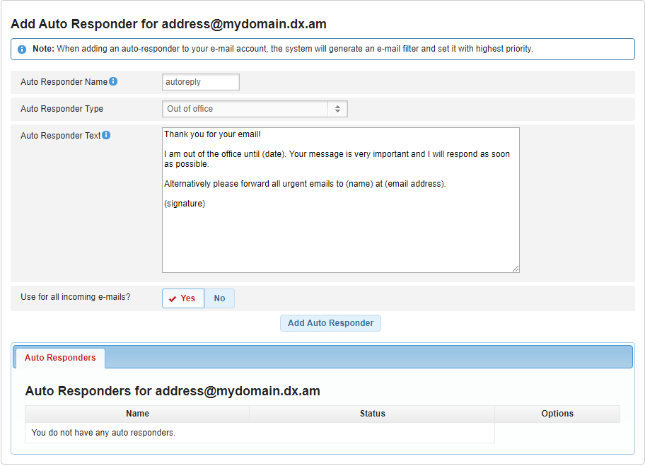 - Use for all incoming e-mails? – If you would like our mail server to send an auto-response to all of the people who send you a message, click Yes. Otherwise, click No and specify your Auto Responder criteria.