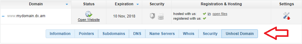 - Click on your domain name, and then open the Unhost Domain menu.