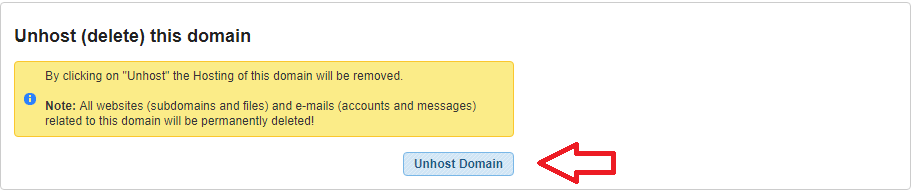 - A warning message will appear informing you that the selected domain (including its sub-domains, mailboxes, and data) will be permanently removed from the server. Click Unhost Domain to continue.