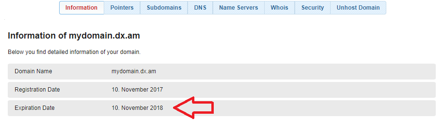 Your domain’s expiry date will be listed under your domain name (as shown above).