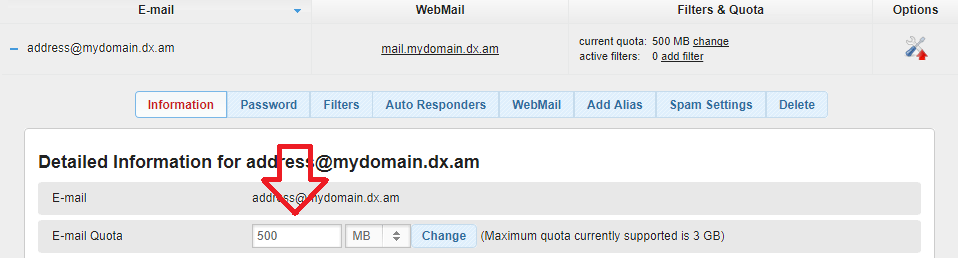 Note: The maximum quota that can be set for an e-mail account on a paid server is 3GB (3000MB). On a Free web server, the limit is 50MB.
