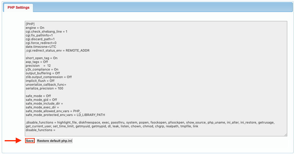 - You should now have full access to the contents of your PHP.ini file. Make all necessary edits and confirm your changes by clicking on the Save button: