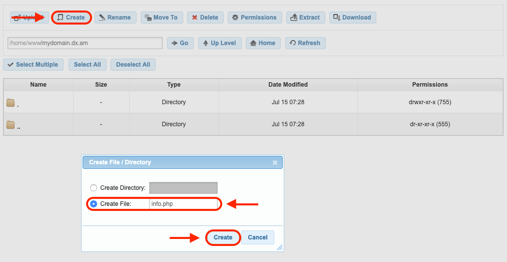 - Name the new file info.php. Confirm your choice by clicking on the Create button, as shown in the screenshot below:
