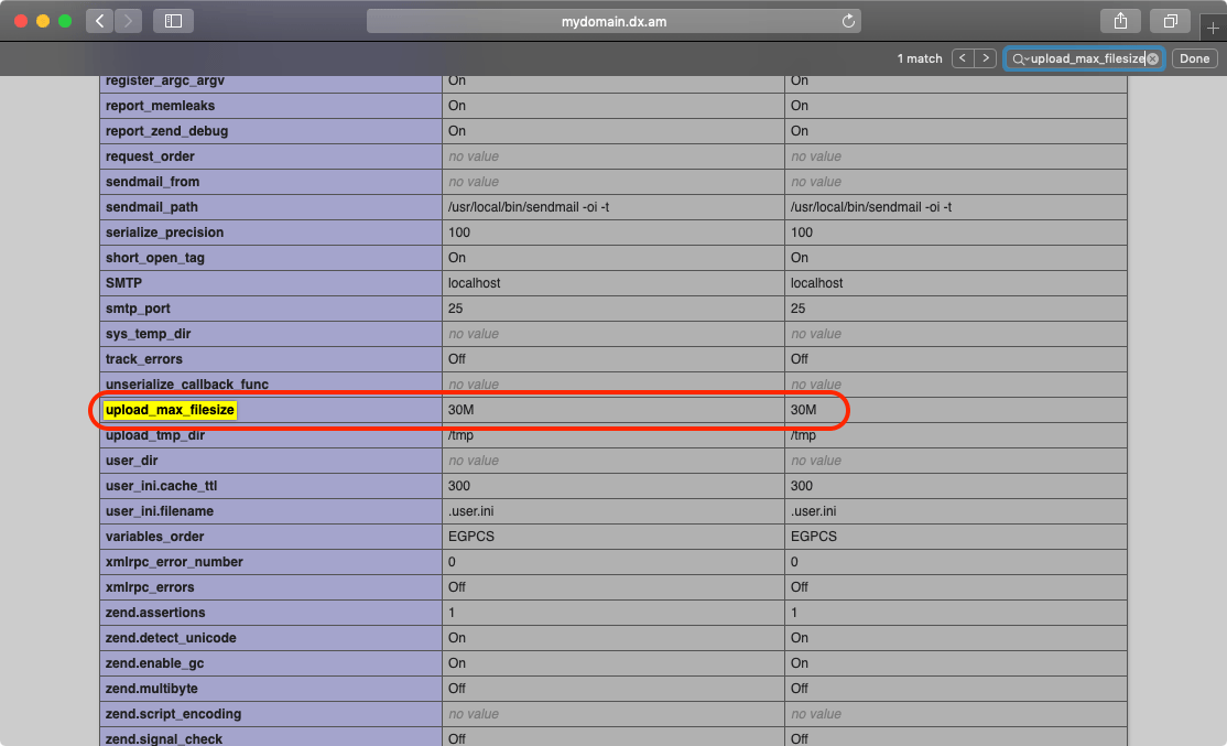 In the example above, the value for the upload_max_filesize variable was doubled from 15M to 30M.