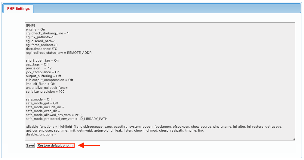 - Press the Restore default php.ini button, as shown in the screenshot below. Once you press this button, the default PHP.ini file will be restored and saved automatically.