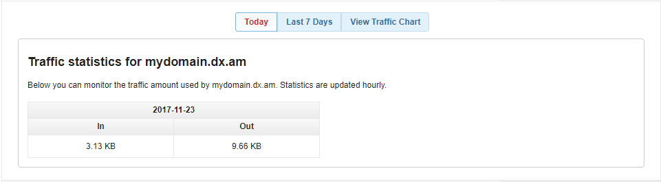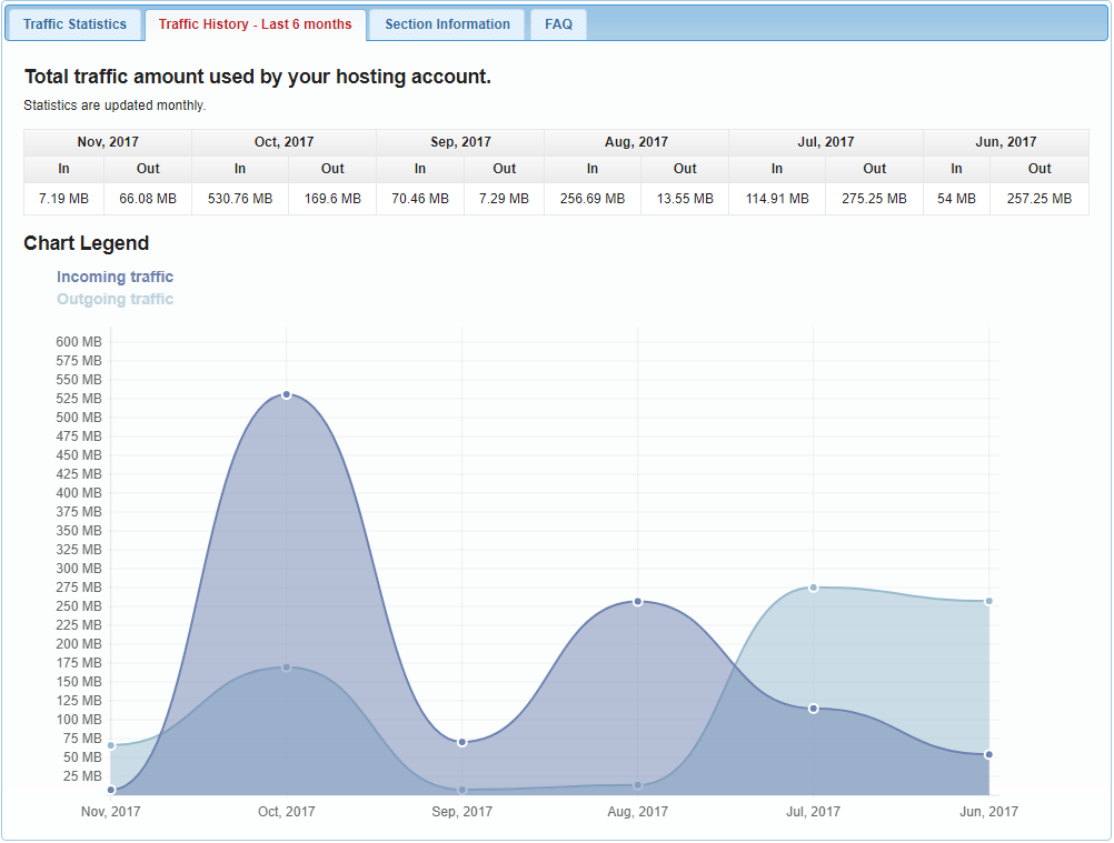 Monthly stats are also available. To see your hosting account’s statistics per month, please select the Traffic Statistics – Last 6 months tab.