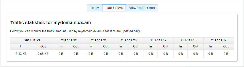 By default, the AwardSpace Traffic Statistics page will display the traffic statistics for the current day. If you wish to view your website’s traffic report for the past 7 days, click on the Last 7 Days button.