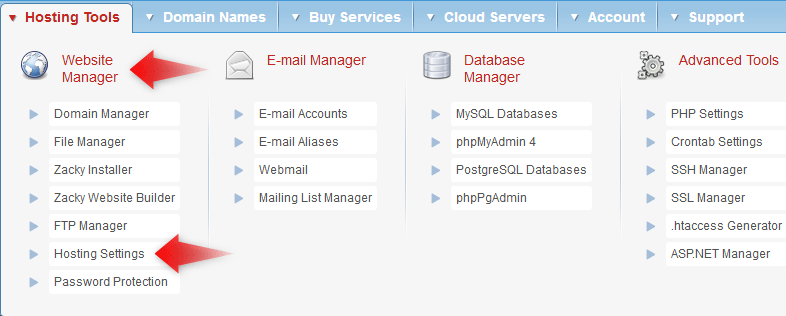 - Hover your mouse over the Hosting Tools menu.