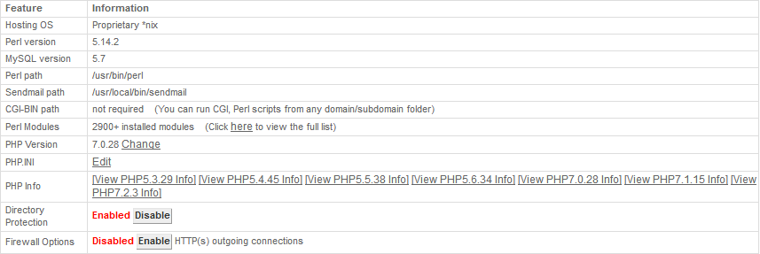 On the hosting account settings page, you can get very helpful information regarding your current server type, MySQL version, Perl version, and Sendmail path.