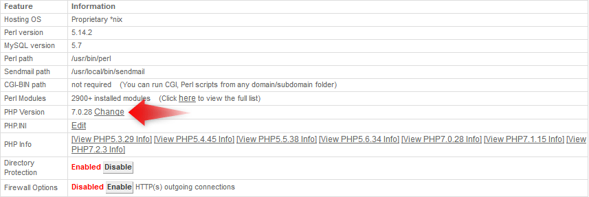 If your software application requires a different PHP version to run properly, you can use the Change link to perform a PHP upgrade/downgrade.