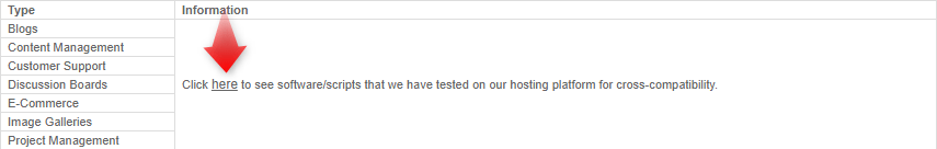 The section below offers quick access to our script installer page and available applications. To find out which software are supported on your web hosting server, click on the here link.
