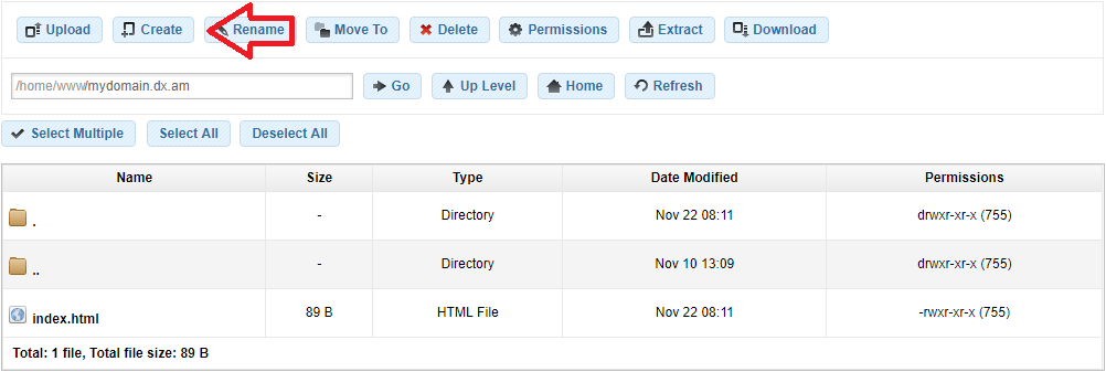 To rename a file/directory on your server, select the file or folder you want to modify and click on the Rename button (or press F2) or right-click on it and select Rename.