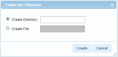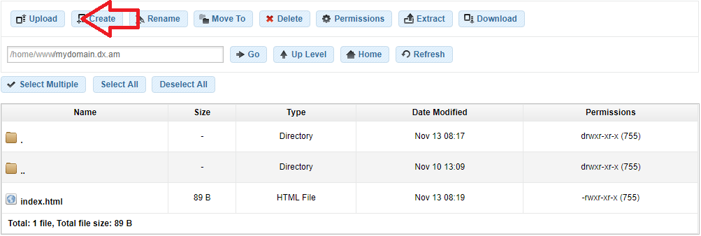 To create a new file or directory in your hosting space, click on the Create button from the main window in the File Manager section.