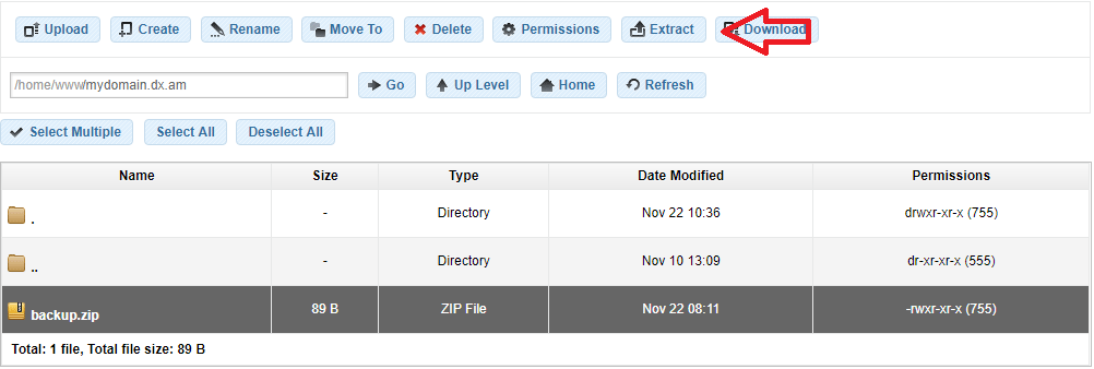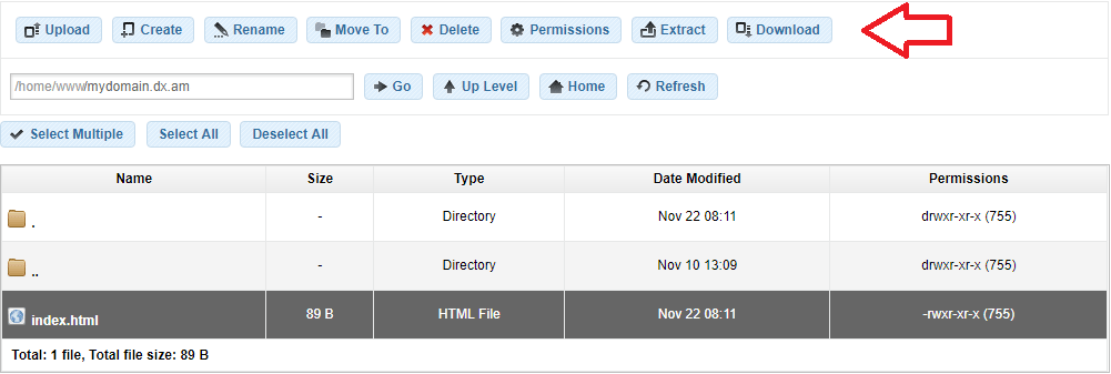 Note: The AwardSpace file management utility does not support downloading entire folders due to browser limitations. If you wish to download a whole directory from your server, please use an FTP client program. For more information on how to establish an FTP connection, please review the How to connect through FTP? tutorial.