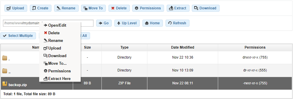 The selected file will be extracted in the current directory on your AwardSpace server.