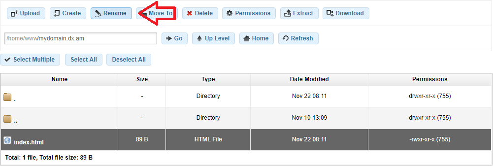 To move a file/folder using the File Manager tool, select the file/directory you want to move and click on the Move To button or press the F6 key.