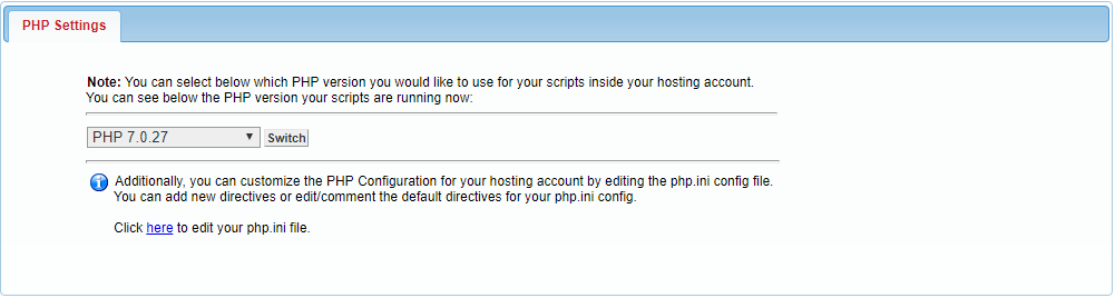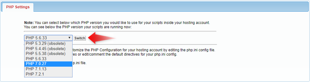By default, the PHP version set on all of our web servers is PHP 5.6. If you wish to switch your account to run a diffent PHP version, follow the instructions provided below: