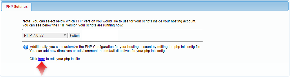 If you wish to modify the PHP settings on your server, click on the here link (as illustrated below).