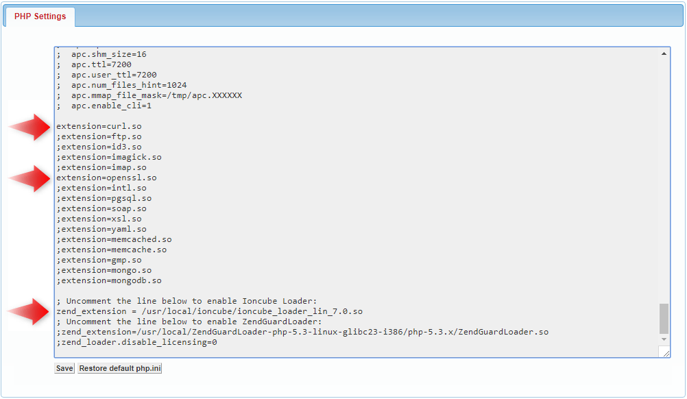 To enable a PHP extension (module) on your server, uncomment the corresponding line by removing the semicolon (;) and press Save.