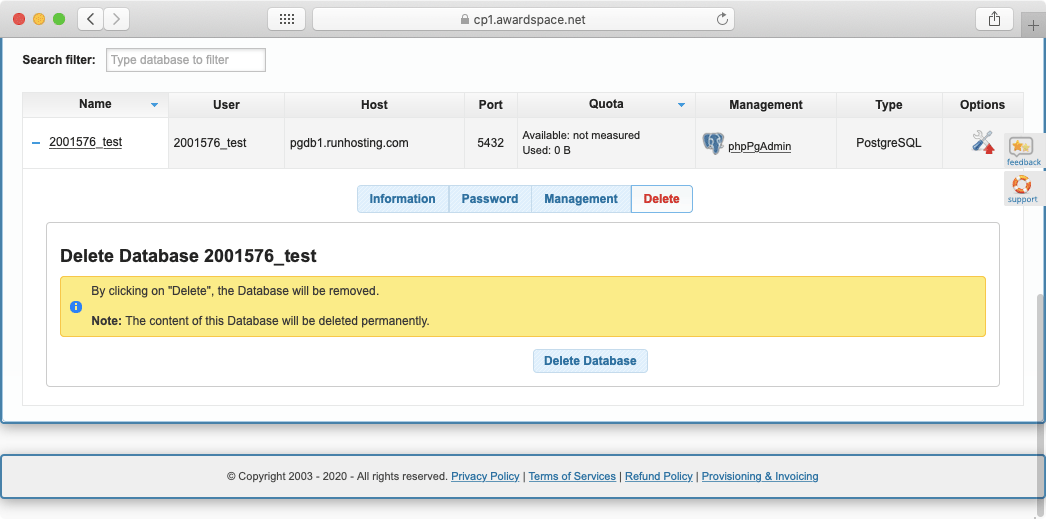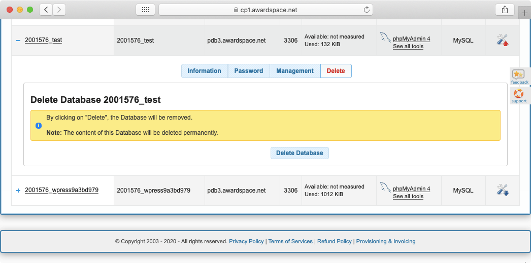 The Delete tab allows you to delete the selected database. Be extra careful when using this option as there is no undo button!