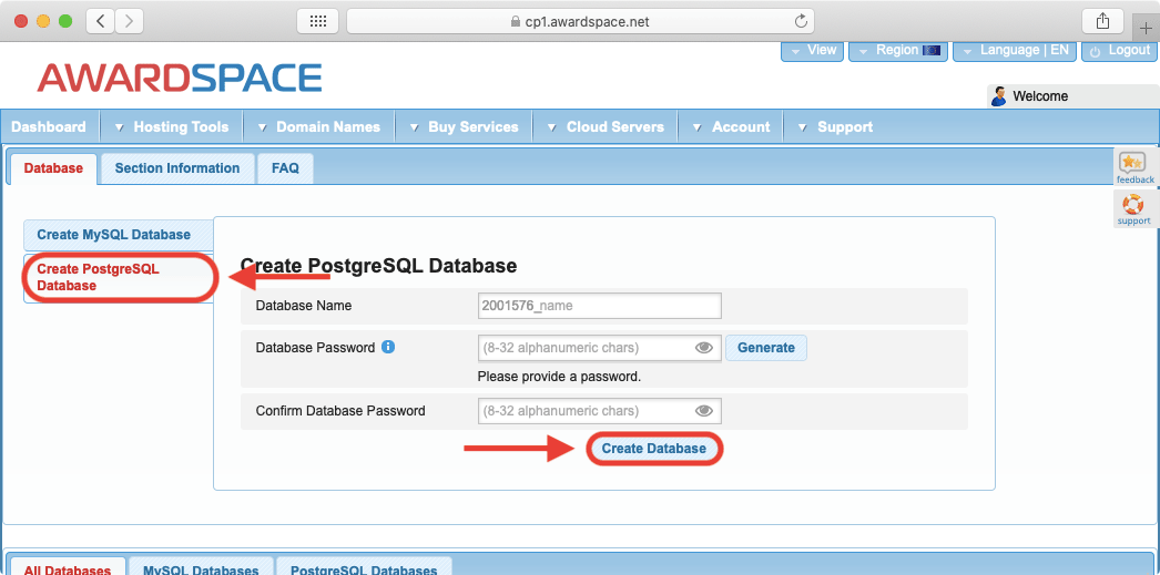 - Make sure that the Create PostgreSQL Database option is active on the left-hand side.