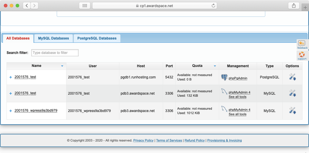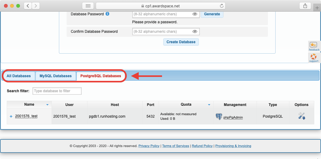 You will notice three tabs at the very top of this section: All Databases, MySQL Databases, and PostgreSQL Databases. Using these tabs you can choose which type of databases you wish to view.
