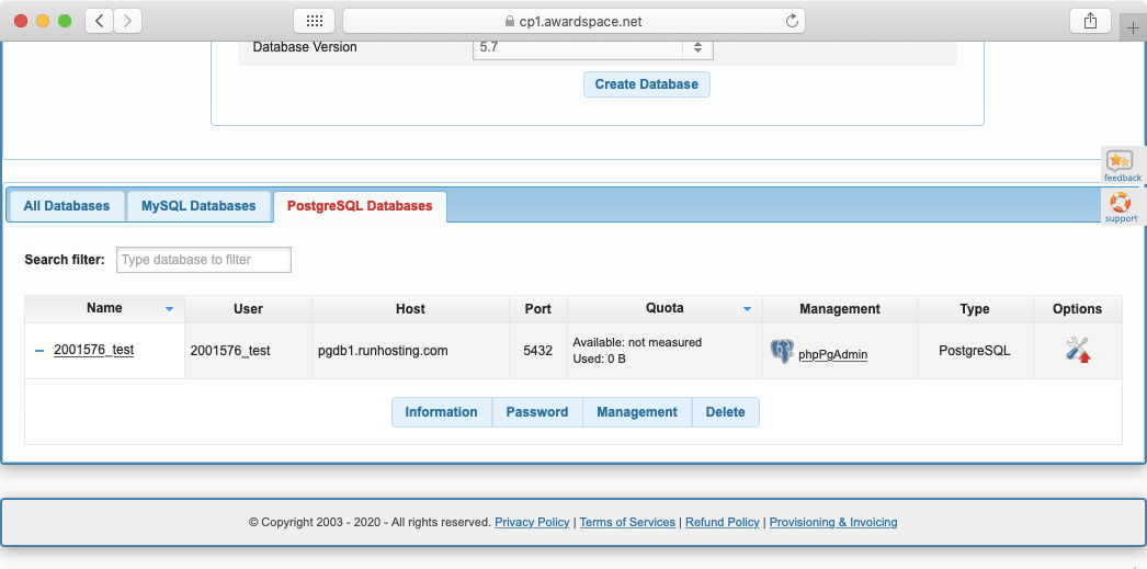 The same table that holds your MySQL databases also lists any PostgreSQL databases that you may have. As we have previously mentioned, you can use the three buttons at the top of the table to choose which type of database you wish to view: