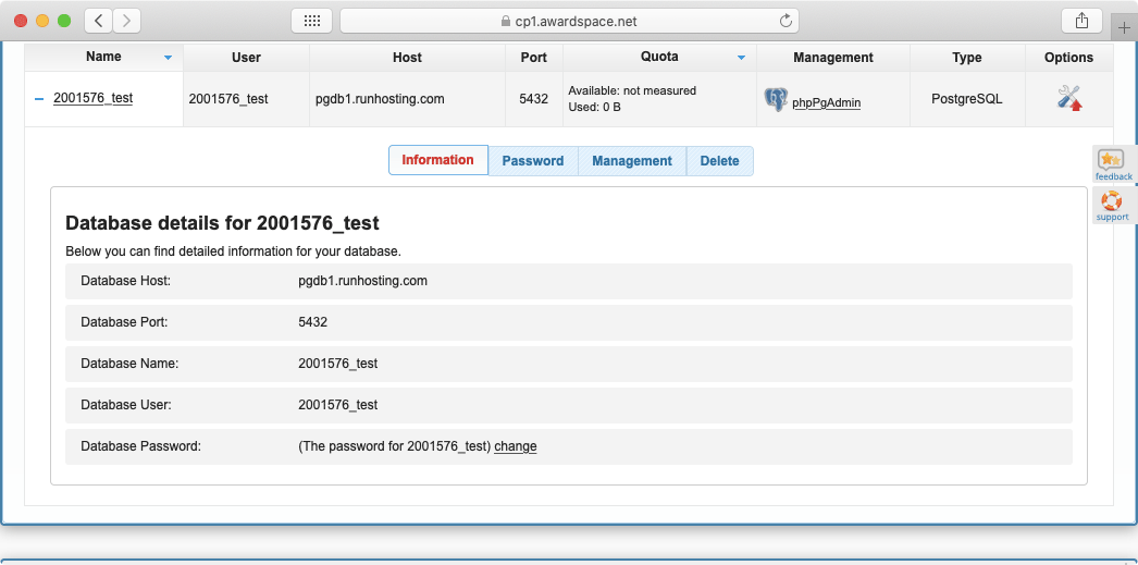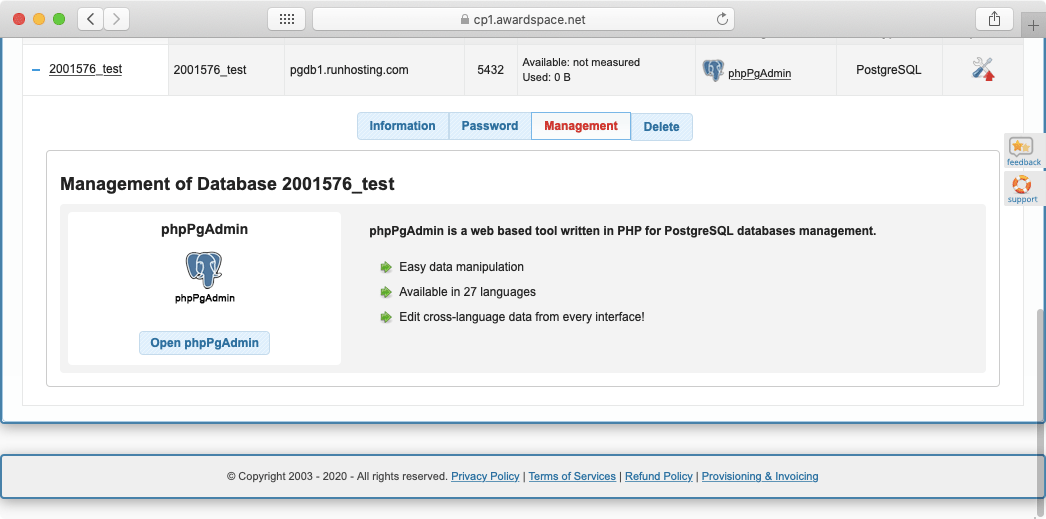 - Management holds a quick link to the phpPgAdmin utility.