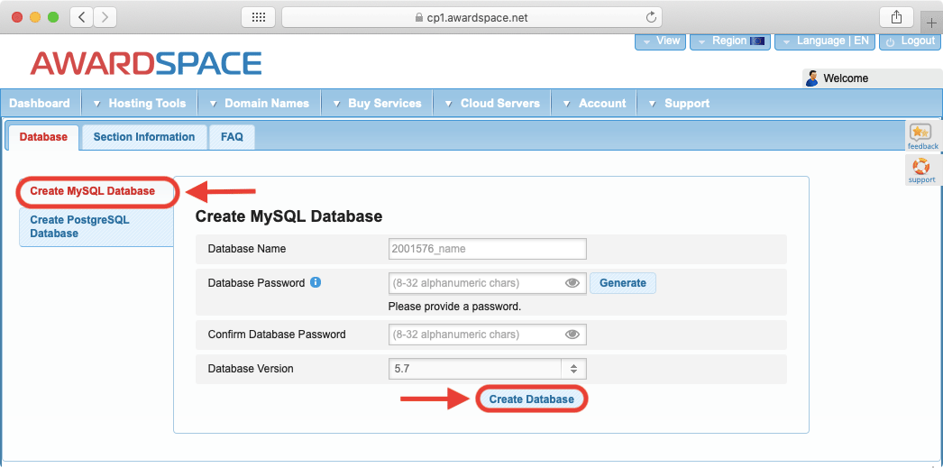 - Make sure that the Create MySQL Database option is active on the left-hand side.