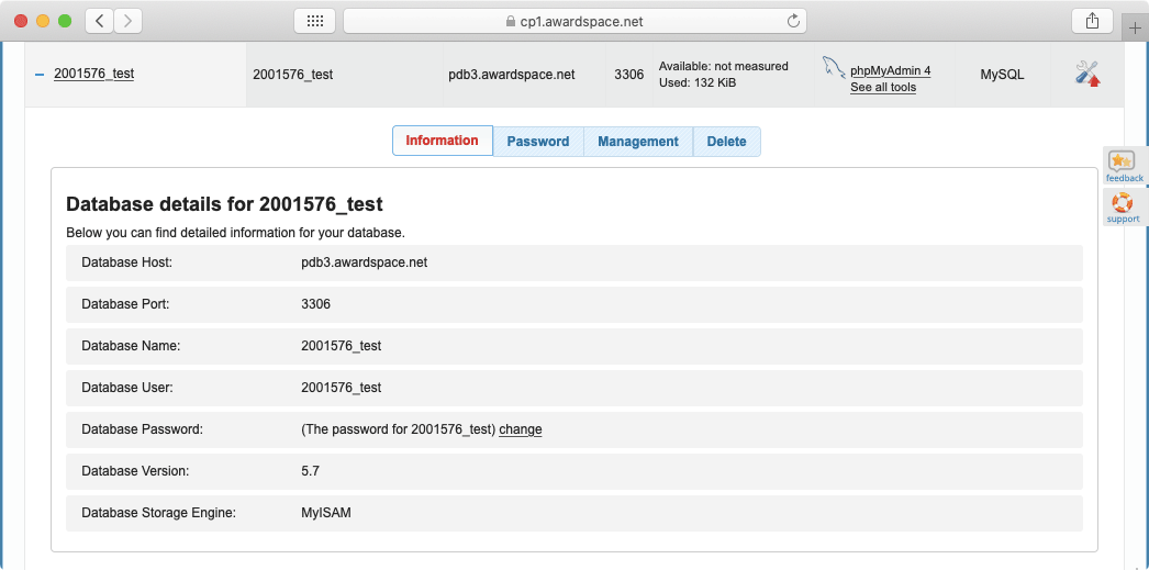The Information tab presents you with all of the basic information for your database. You should reference this tab whenever you are connecting your website to the database.
