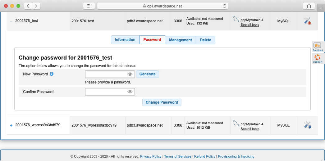 The Password tab allows you to change your database password at any time. There is no need to enter your current database password, just set your new preferred one and you are good to go.
