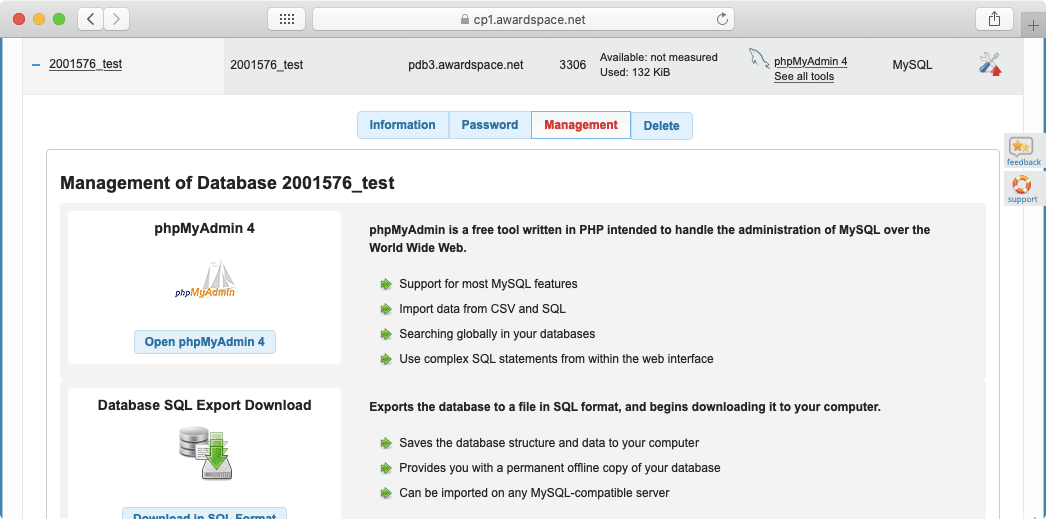 - Management holds quick links to the phpMyAdmin utility and our other database-related management tools.