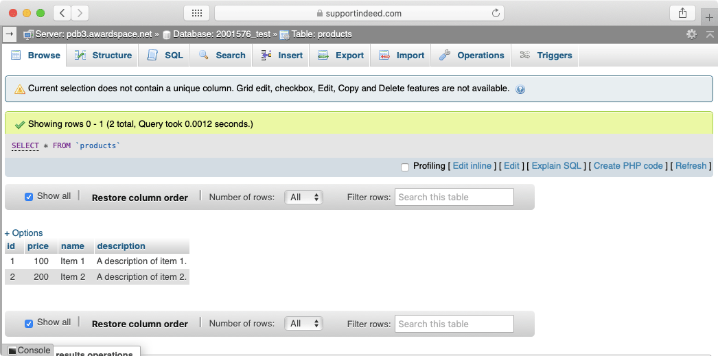When we press the Go button, the SQL command gets executed and the deletion will be completed. Now our table no longer contains the second entry: