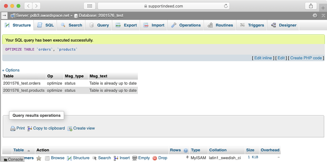 - Once you select the Optimize table command, it will be executed automatically and you should be presented with the Your SQL query has been executed successfully. message: