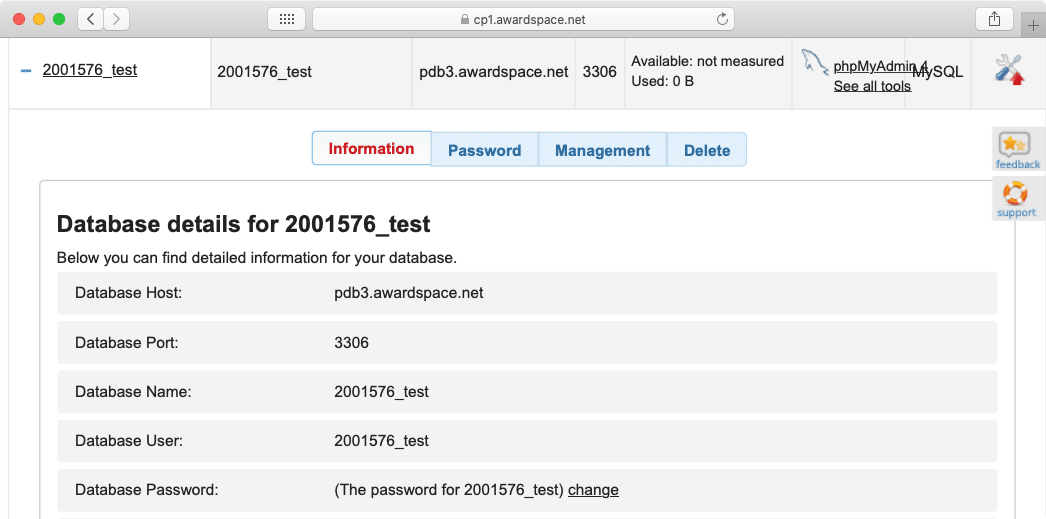 In the Information tab, you will find your Database Host, Database Port, Database Name, Database User, Database Version, and Database Storage Engine. Compare this information to the database settings in your website configuration file and make changes where necessary. If you are not sure what password is assigned to your database, you can reset it from the Password tab in the Database Manager. Additional help with connecting your website to your database, including sample connection code, can be found in our article on where to find the database connection settings.