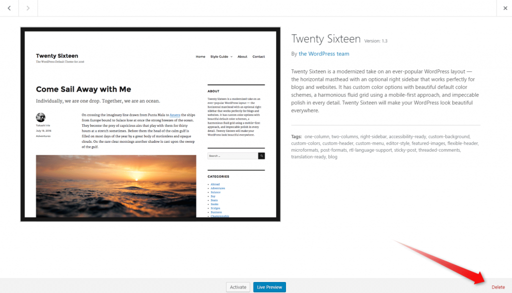 After you click the Theme Details button, a pop-up window will appear. In the bottom right corner, there is a Delete button. Click it.