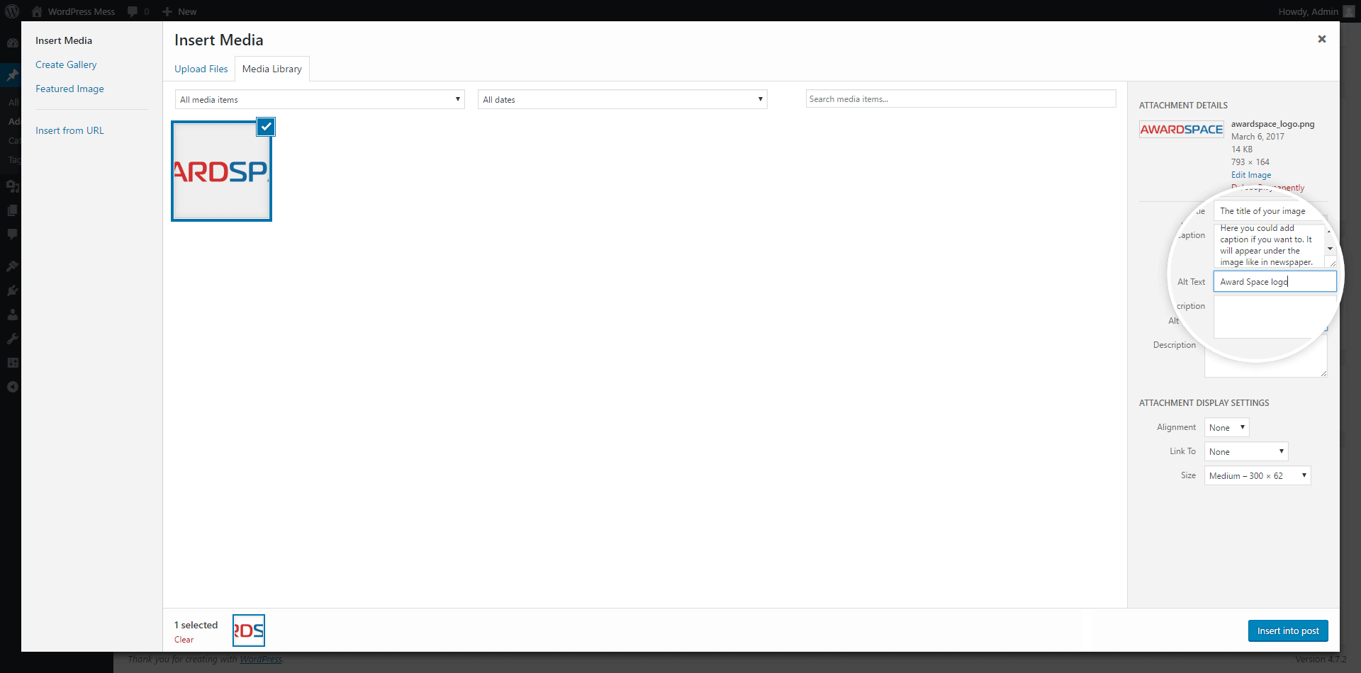 Once you’ve configured the settings to your liking, click the “Insert into post” button to add the media to your post. The media will now appear in your post editor where you placed your cursor. You can further adjust the media’s position and settings directly from the post editor by clicking on the media to reveal alignment and editing options.