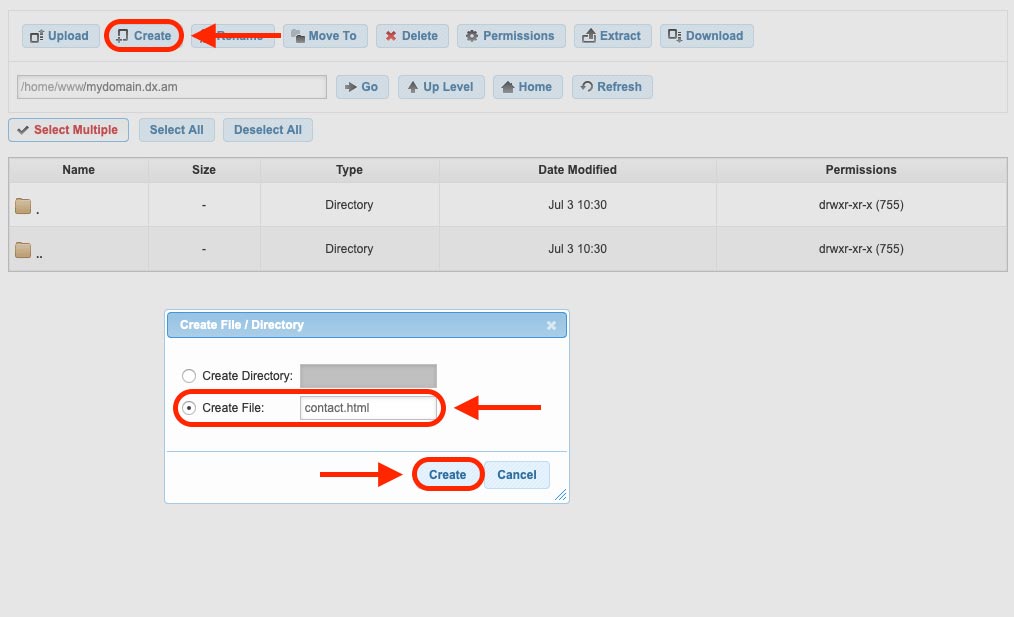 - Click on the Create button, switch to the option to Create File and make a new HTML document. Name it contact.html as is shown in the screenshot below.