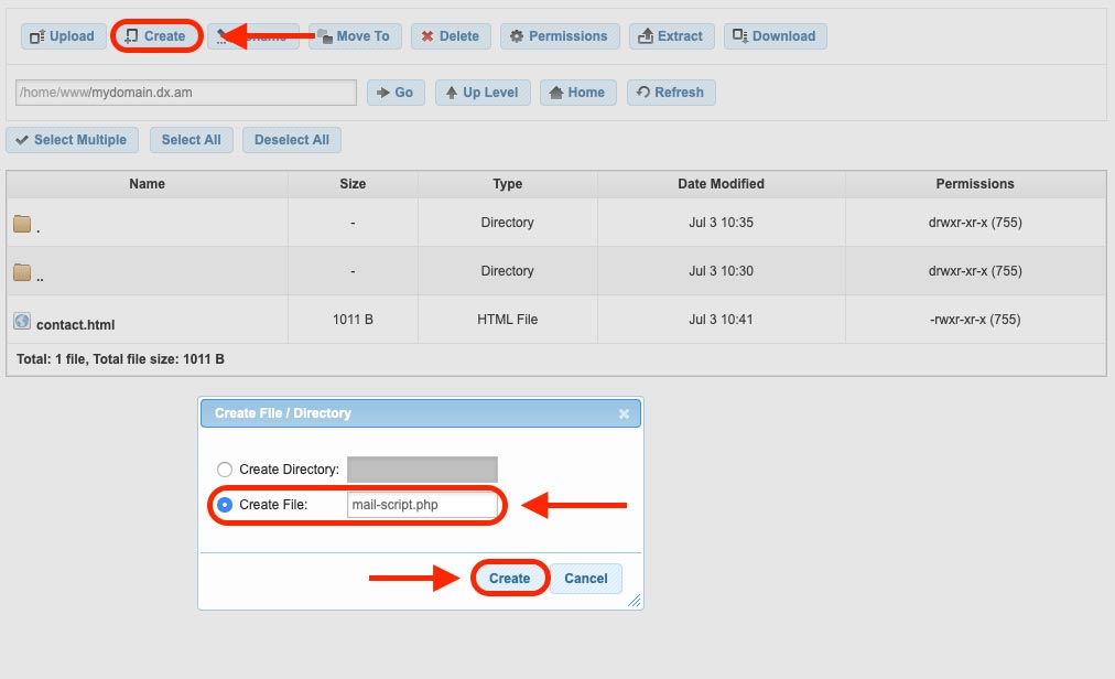 - Using the Create button, make a new file. This time call it mail-script.php. Make sure that this new file is placed in the same directory as the contact.html document. You may refer to the screenshot below: