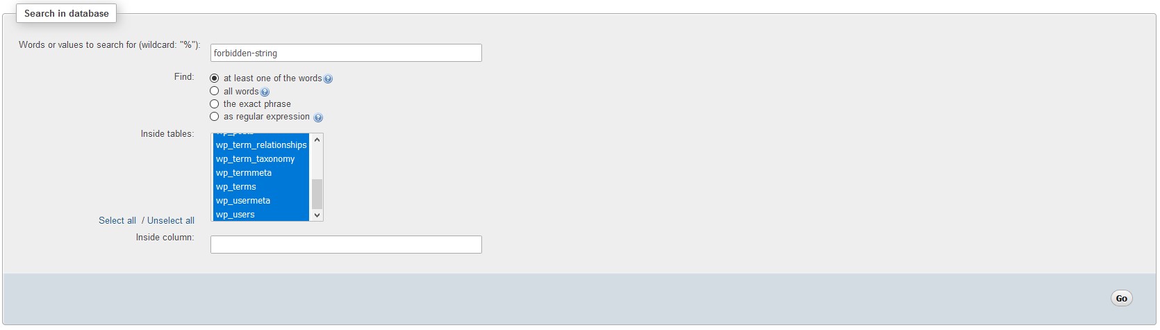 As mentioned above, some websites store their content inside a database. A similar website would be one built with WordPress. To search and remove the forbidden string inside a database follow the steps below: