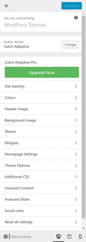 - You’ll be redirected to the Theme Customizer – the front end of your website will be accompanied by a left-located sidebar menu.