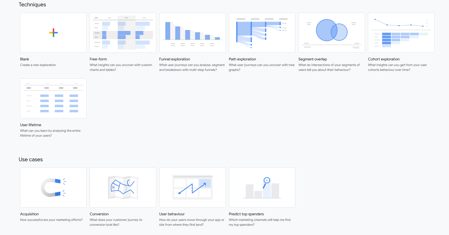 - Funnel Exploration. This template can be very helpful in monitoring your funnel performance and what works for your purchase journey and what doesn’t.